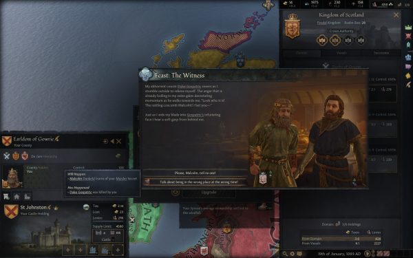 None of the charm or seriousness from Crusader Kings 2 is lost despite the more cartoony look of characters. The frequency of random encounters lets you build a unique narrative in your head about what your leader is like. In the case of King Malcolm of Scotland, he was a pretty straightforward, friendly yet firm leader, but don’t p**s him off or get him drunk.