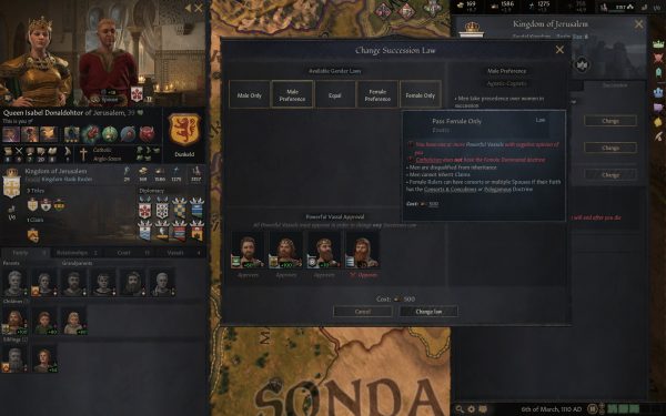 One unexpected outcome of this win and death occurring at the same time was that I was faced with a Dynasty decision. I could carry on as Malcolm's son, Donald, and lead Scotland for another generation, or play as my beneficiary, Isabel, who was crowned the Catholic - and female! - leader of the Kingdom of Jerusalem.
