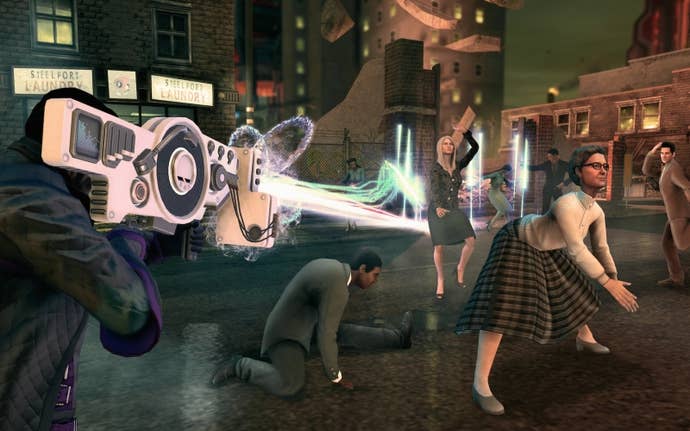 While Volition is finishing up its own tale, it's also using the latest Saints Row to poke fun at other games, movies, and television shows. Within the game's first two hours, you can expect to see a flight sequence asking you to "do a barrel roll," a 3D-riff on Space Invaders, shipboard romance options like Mass Effect, and a Ghost Recon-style opening with slow-motion door breaching and tasks like "kill terrorists." The gameplay steals shamelessly and perfectly from Crackdown and inFamous, giving a city to explore and collectible, building-borne widgets to boost your considerable superpowers.